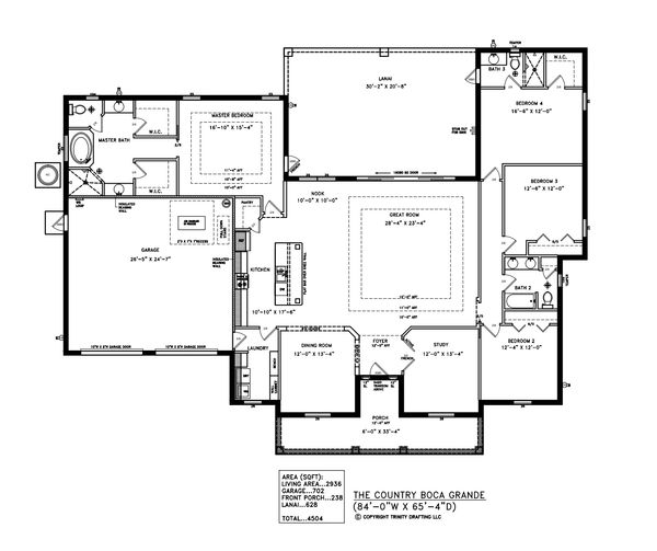 The Country Boca Grande is a grand 4-bedroom, 3-bath estate home with a dedicated study and oversized living areas, designed for homeowners who want space without compromise. A massive central great room anchors the layout and flows into an open kitchen with island seating, walk-in pantry, and adjacent dining space—ideal for entertaining on a larger scale.